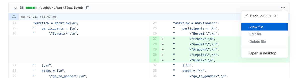 If you want to see the rendered notebook, you can use the "View file" menu option as a shortcut to quickly get to it. We often find it helpful to have them open to the side while reviewing the code diffs.
